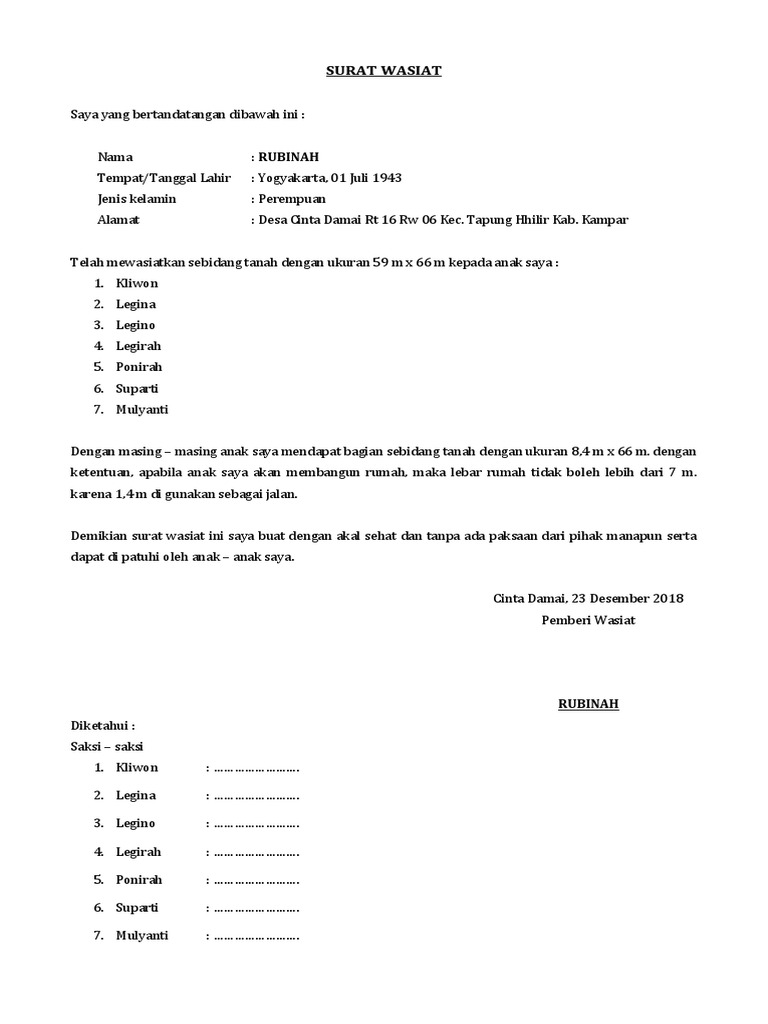 Untuk surat wasiat yang ditulis atau dibuat oleh pemberi warisan, seperti orangtua. Contoh surat wasiat harta warisan lewat notaris ~ sering kali harta warisan menjadi konflik lingkungan keluarga tanpa adanya surat wasiat sebagai bukti amanat dari seseorang yang telah meninggal dunia. Meninggalkan harta benda di karenakan meninggal sering kali menyebabkan konflik dalam keluarga dan membuat harta yang di tinggalkan di perebutkan oleh para. Contoh surat rasmi di bawah adalah contoh surat yang betul. 100%100% found this document useful, mark this document as useful. Peta malaysia profil letak sistem pemerintahan kepala. Adapun hukum yang memberlakukan keputusan pemilik warisan tidak dapat diganggu gugat. Agar kamu tidak bingung, kamu bisa menyimak contoh surat wasiat yang benar jangan khawatir, 99.co indonesia telah menyusun contoh format surat wasiat yang benar dan juga syarat dan tata cara penulisan surat wasiat. Sebuah surat wasiat bisa dibuat secara dibawah tangan atau dengan akta notaris, namun pada umumnya surat wasiat dibawah dengan akta notaris. Anda dapat menggunakan aplikasi finansialku. Text of contoh surat wasiat. Doc wasiat docx nur khalilah academia edu. Surat kematian sangatlah penting digunakan untuk.