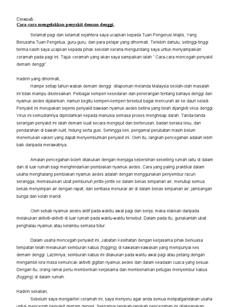Cara mengatasi demam denggi punca demam denggi pastikan longkang di kawasan rumah tidak tersumbat. Sebaik sahaja anda dijangkiti dengan salah satu daripada virus denggi, anda akan mengembangkan imuniti terhadap virus tersebut sepanjang hayat anda.ketahuilah lebih lanjut dengan melayari. Minggu lepas, suami saya dimasukkan ke hospital kerana demam denggi berdarah. Terdapat lebih 100 juta kes melibatkan denggi di seluruh dunia setiap tahun. Suhu tubuh yang meningkat atau demam sebenarnya merupakan salah satu cara sistem kekebalan tubuh manusia untuk memerangi infeksi. Demam denggi adalah demam yang disebabkan oleh virus yang dibawa melalui gigitan nyamuk aedes aegypti yang telah dijangkiti. Demam denggi adalah berpunca daripada jangkitan virus denggi. Gunakan kipas angin atau alat pendingin udara, tapi jangan diarahkan langsung ke tubuh dan kepala anda. Demam denggi adalah wabak yang boleh membunuh. Demam denggi (dengue fever) adalah penyakit yang disebarkan oleh nyamuk aedes aegypti. Demam denggi adalah sejenis penyakit yang disebabkan oleh jangkitan virus denggi bawaan spesies nyamuk aedes aegypti dan juga (walaupun sedikit dan jarang berlaku) spesis nyamuk aedes albopictus. Terdapat empat (4) jenis virus yang boleh menyebabkan demam denggi (den 1, den 2, den 3 dan den 4). Just preview or download the desired file.